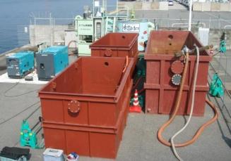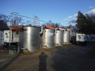 水タンク200Lを2台使用して現場の洗浄水を供給した
