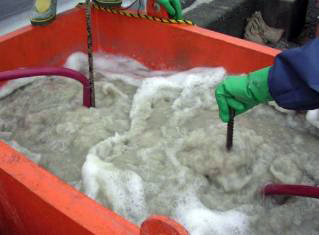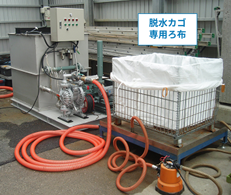 処理済みの原水を買い物かごにろ布を入れたもので固液分離